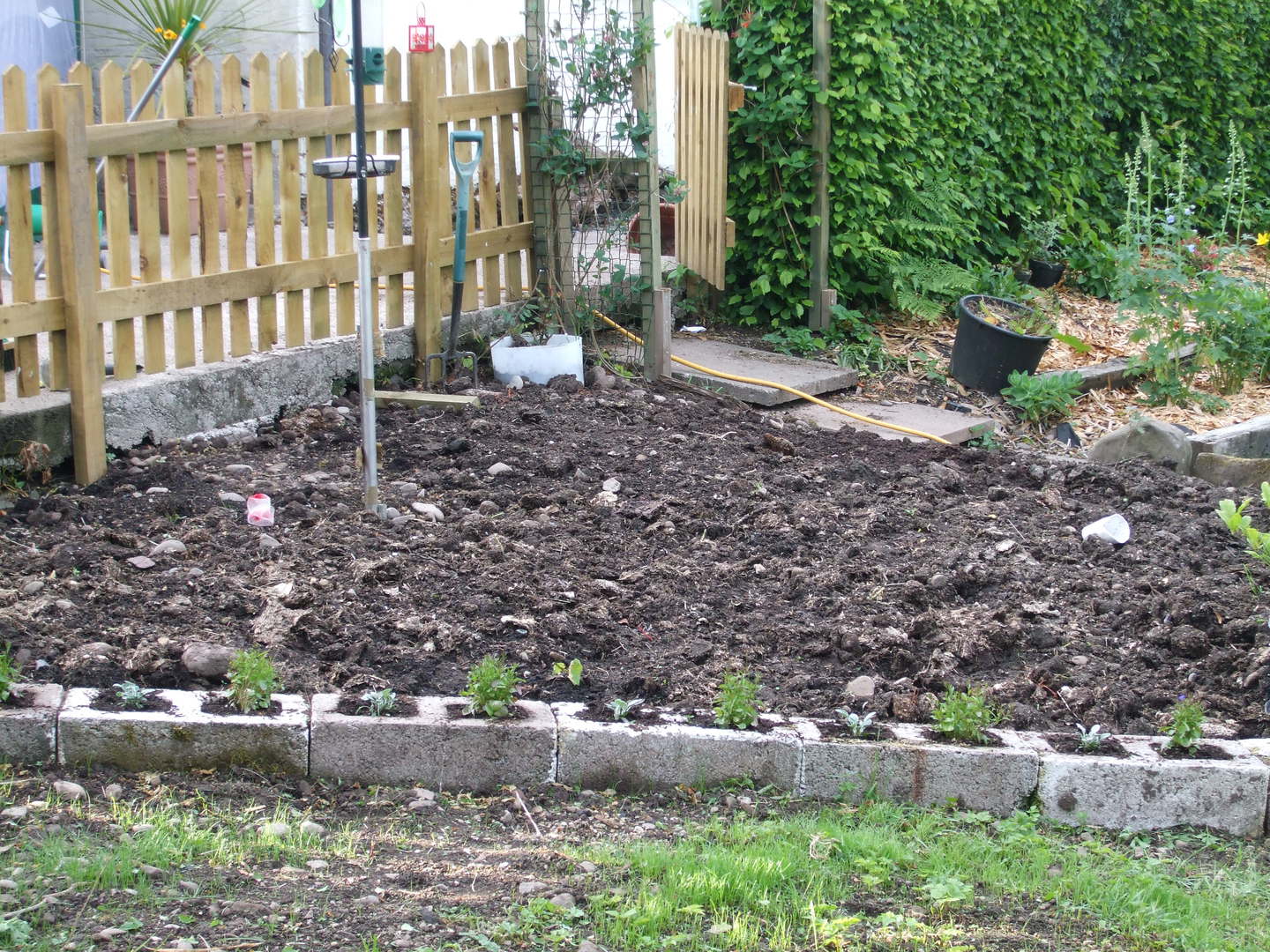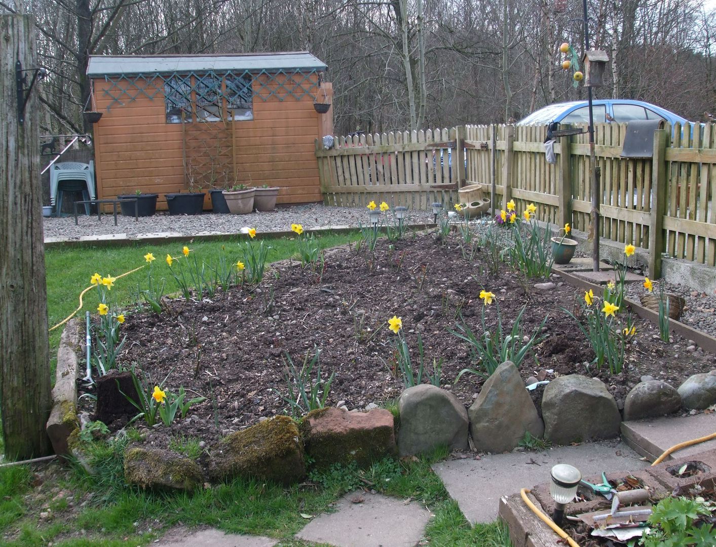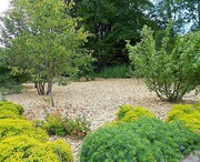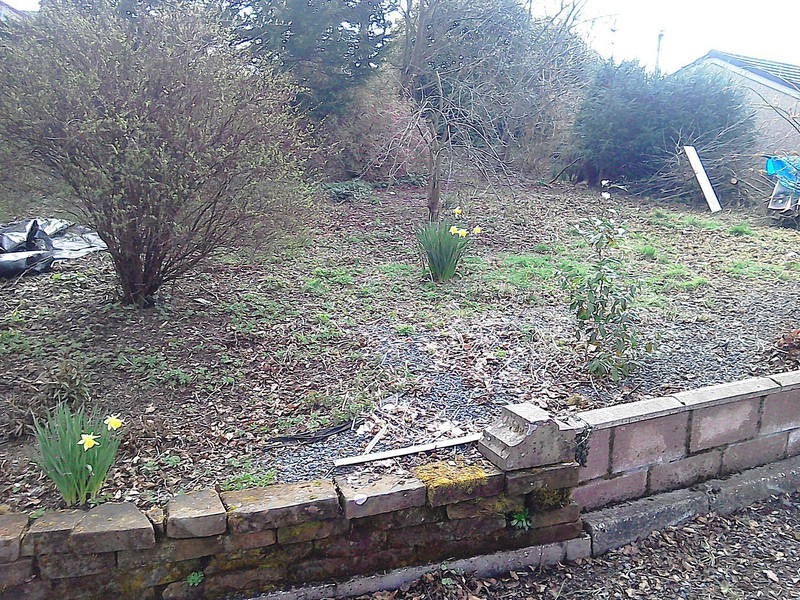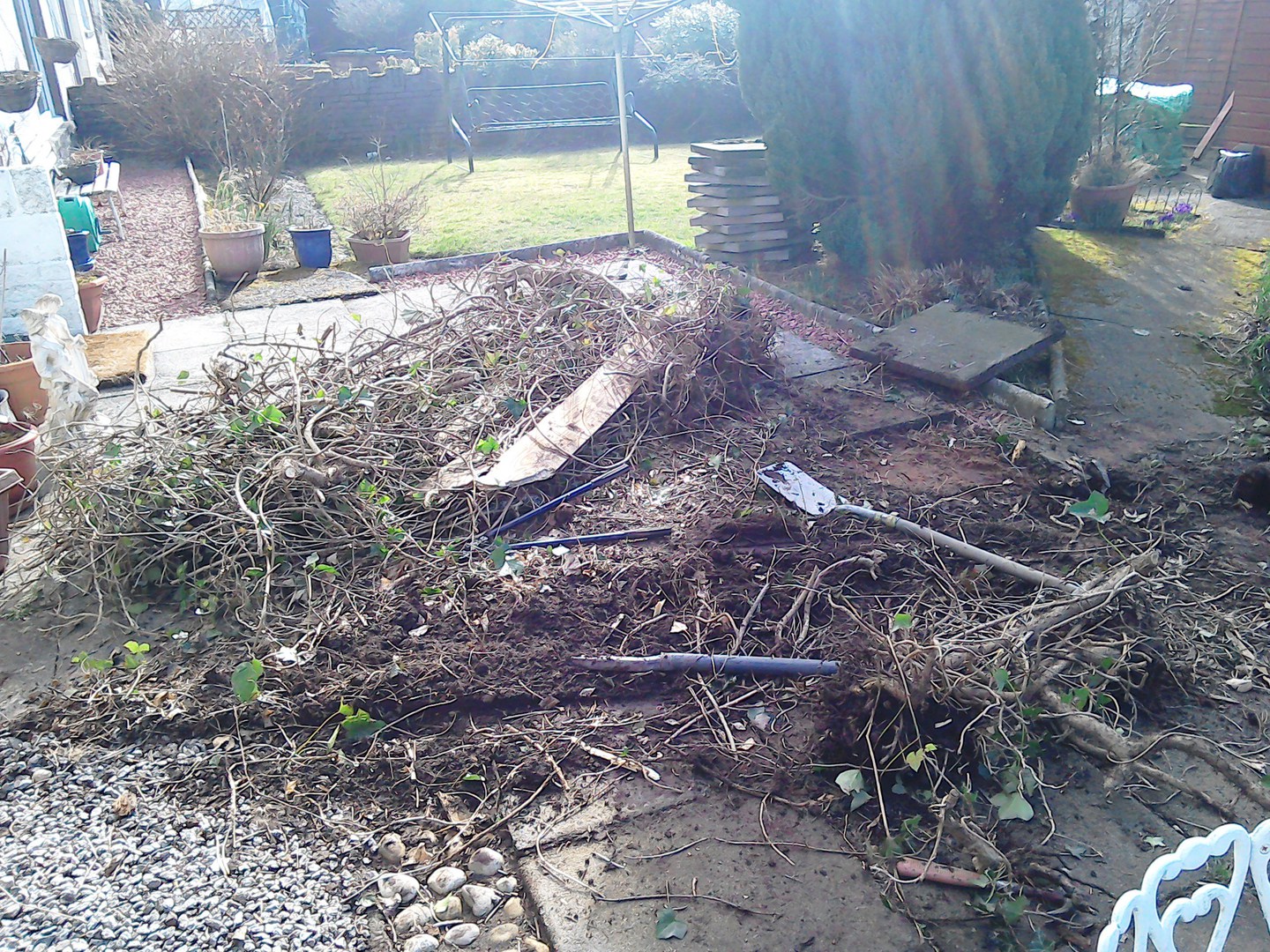 Below - old rockery cleared of shrubs, stones & old wooden edging. Bed then dug over, covered in weed supress, replanted with shrubs & rockery stones replaced. Finished with new wooden edging & topped with grey slate.