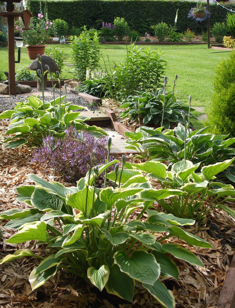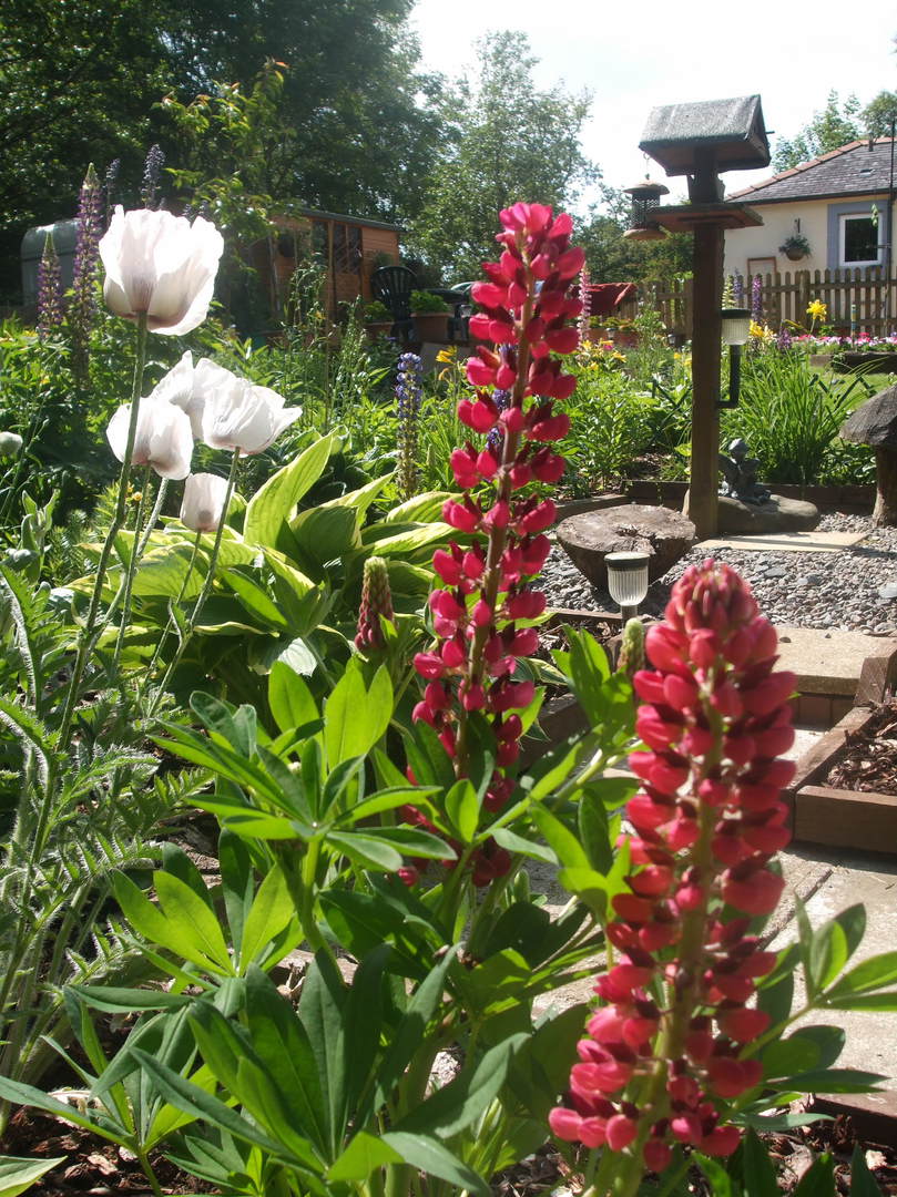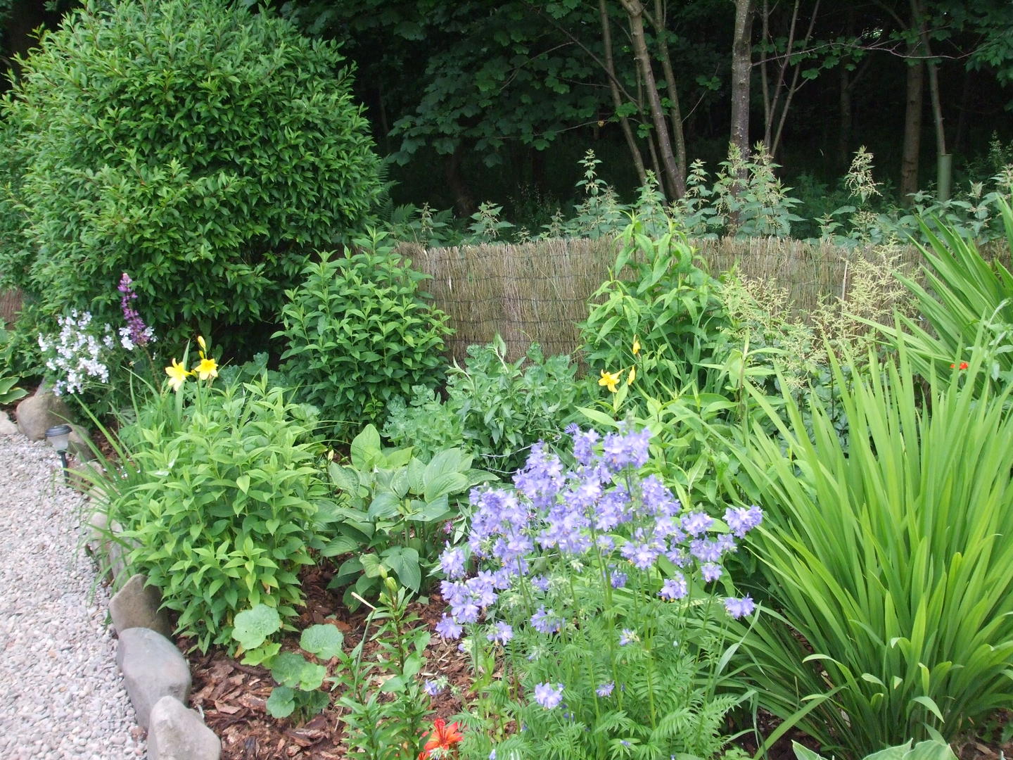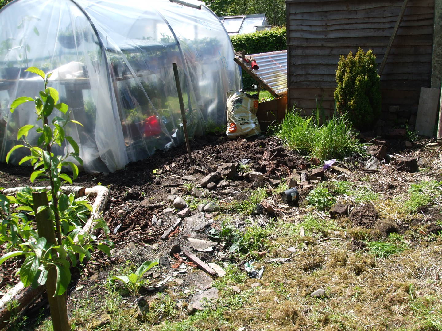 Below - old rockery cleared of shrubs, stones & old wooden edging. Bed then dug over, covered in weed supress, replanted with shrubs & rockery stones replaced. Finished with new wooden edging & topped with grey slate.