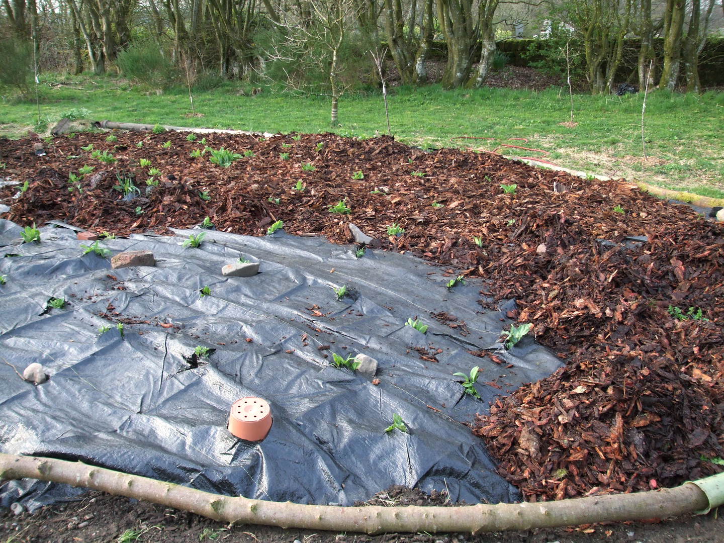 Below - strim down weeds, lay weed suppress & cover with 6 tonnes of bark chips.