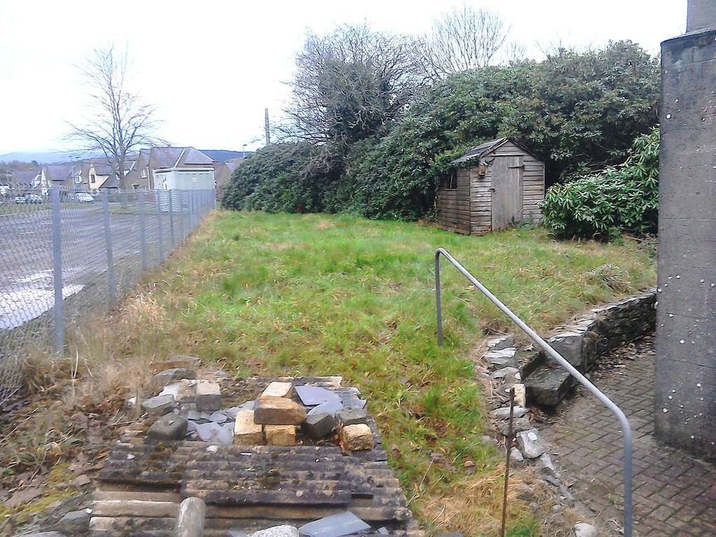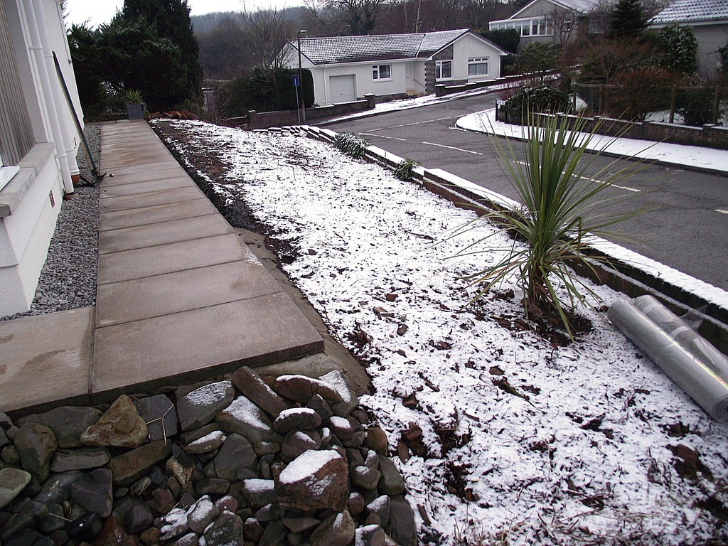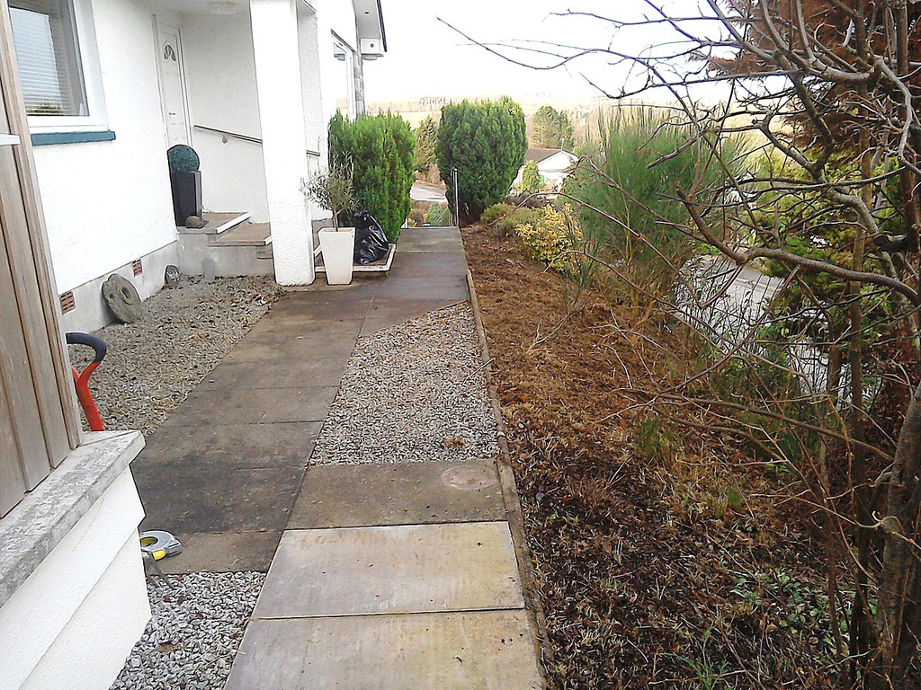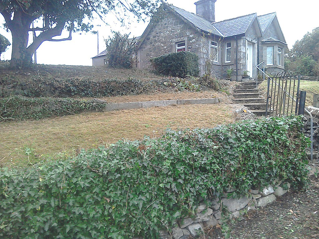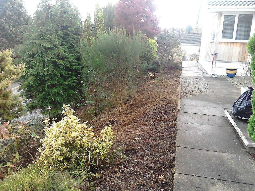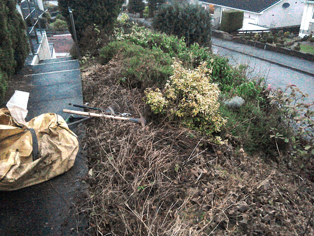 (overgrown scrub & shrub clearance, removal of conifers & ground cover, bank reduction & level ground, weed supress, cobbles, flagstones)