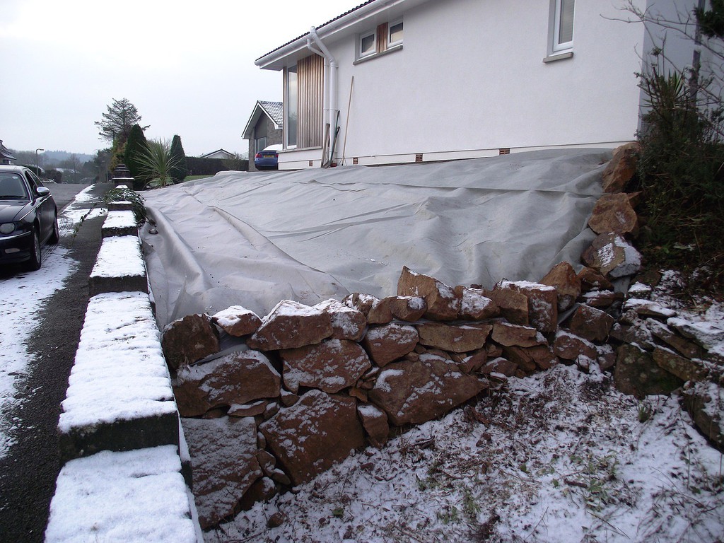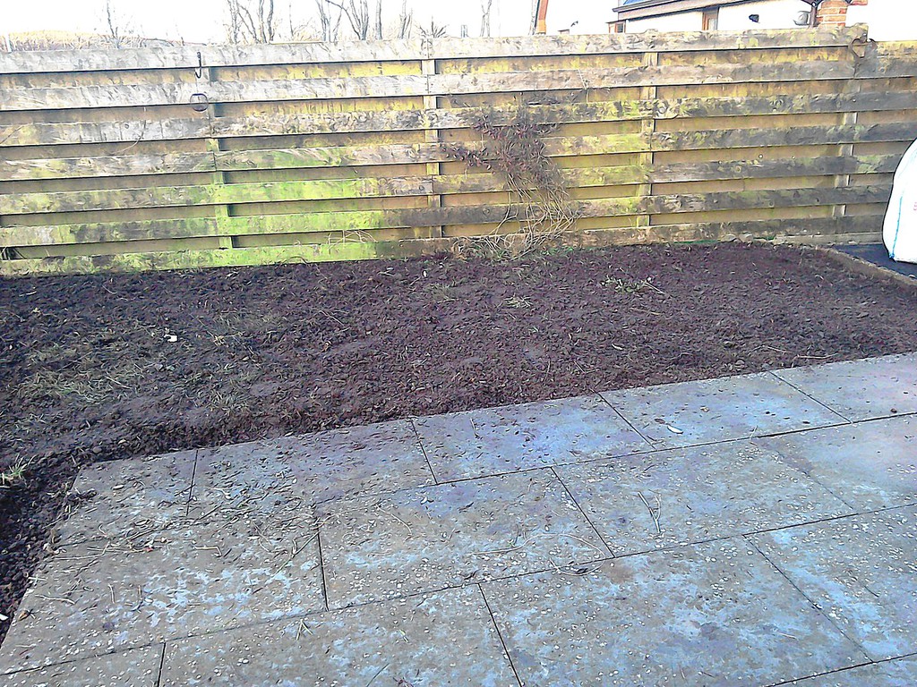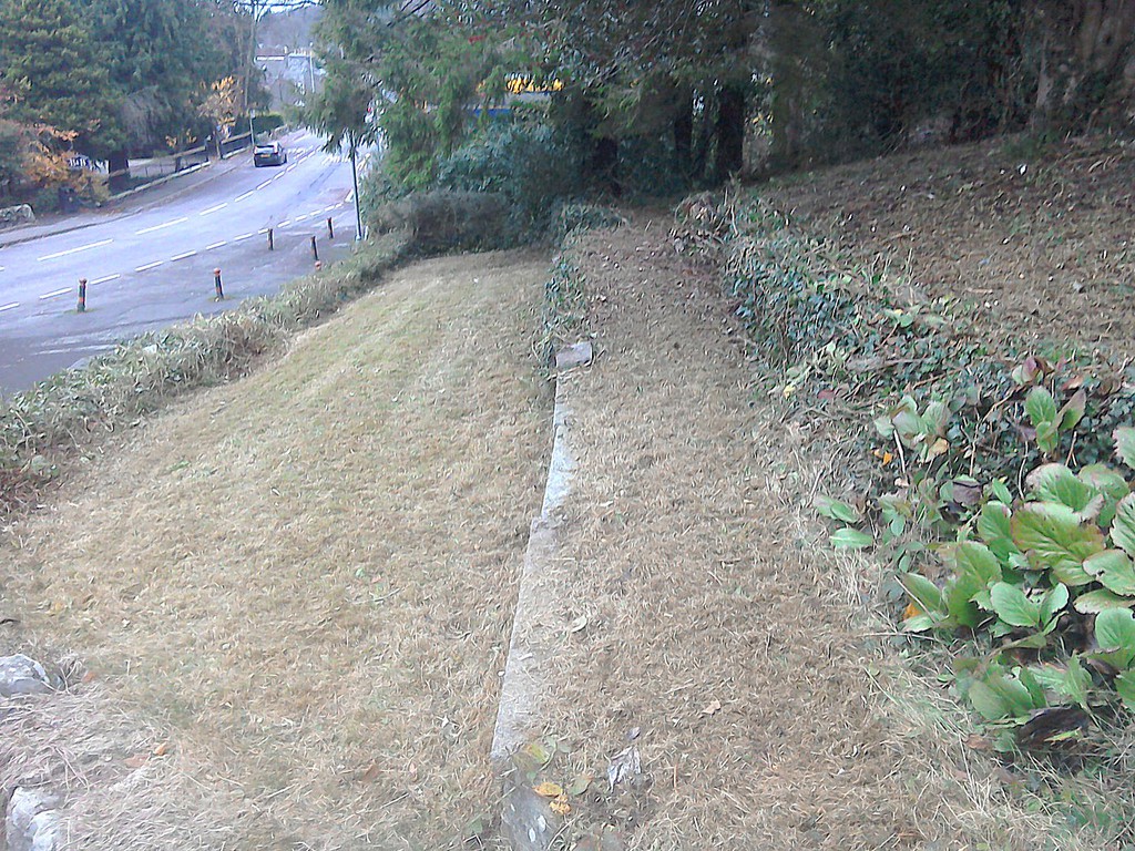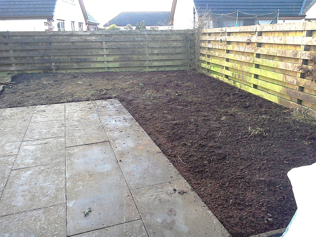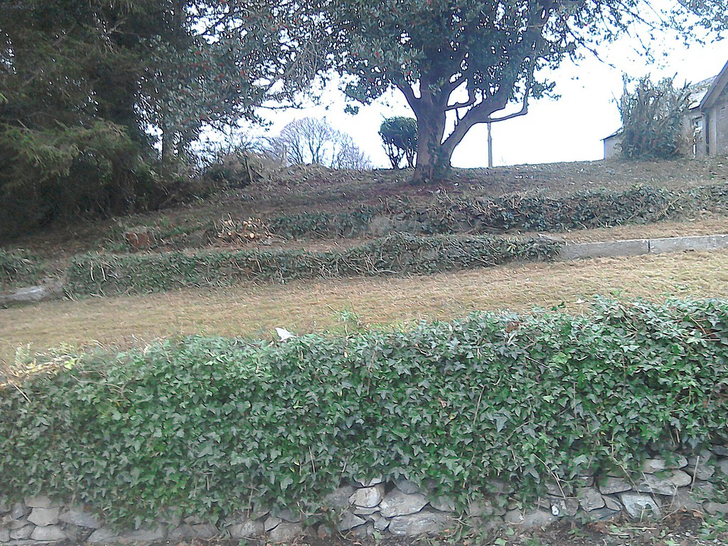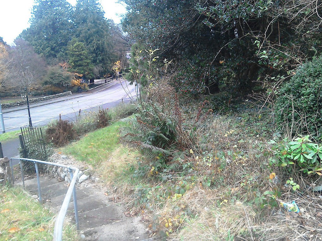 (overgrown scrub & shrub clearance, removal of conifers & ground cover, bank reduction & level ground, weed supress, cobbles, flagstones)