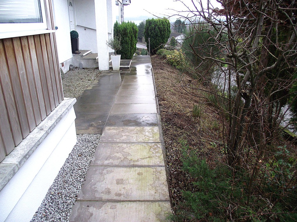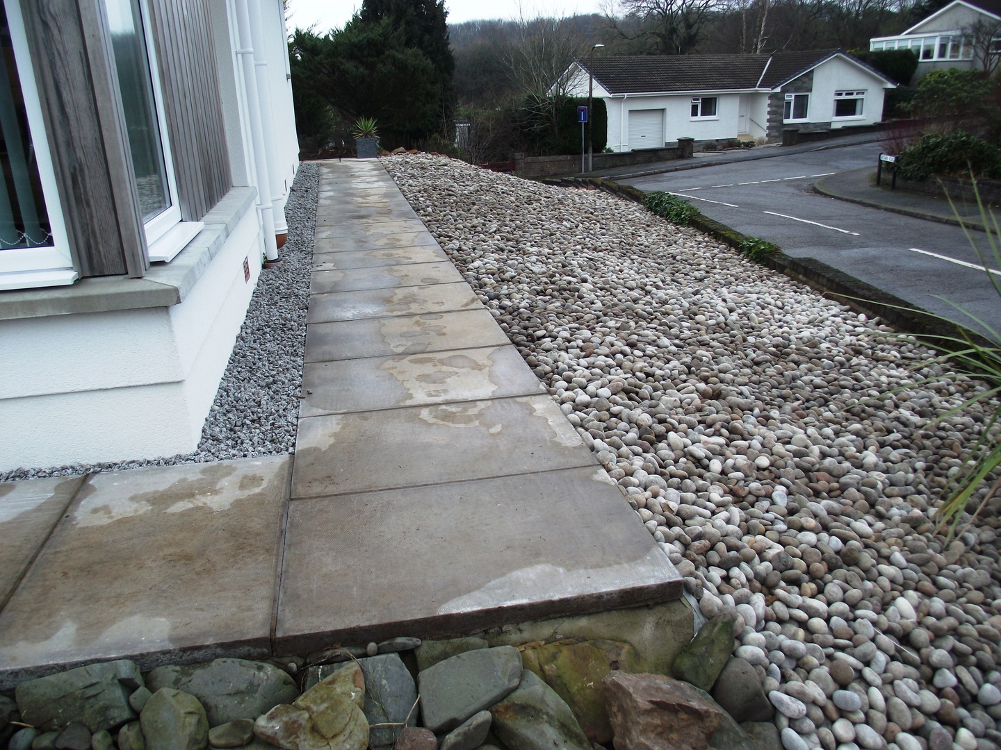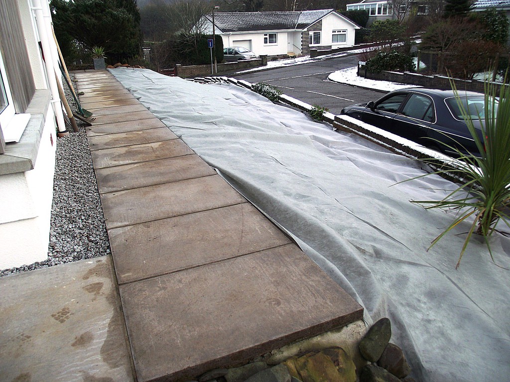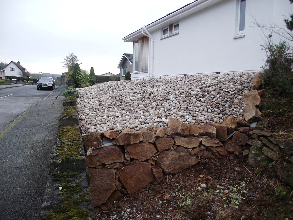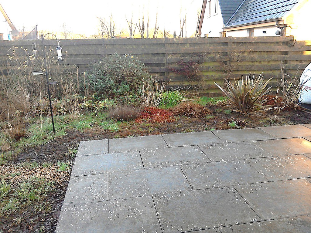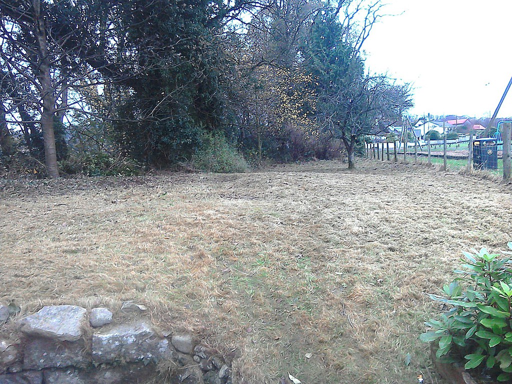 (overgrown scrub & shrub clearance, removal of conifers & ground cover, bank reduction & level ground, weed supress, cobbles, flagstones)