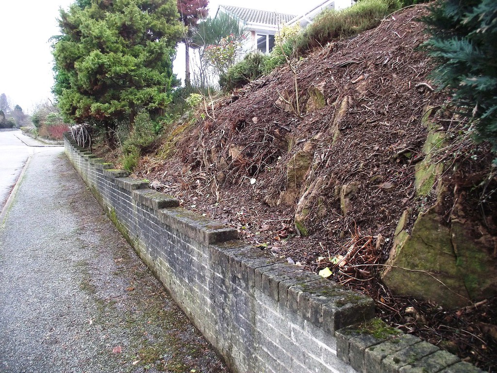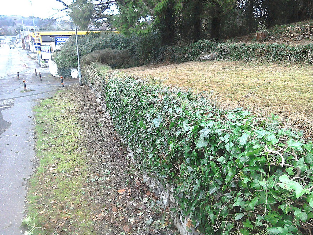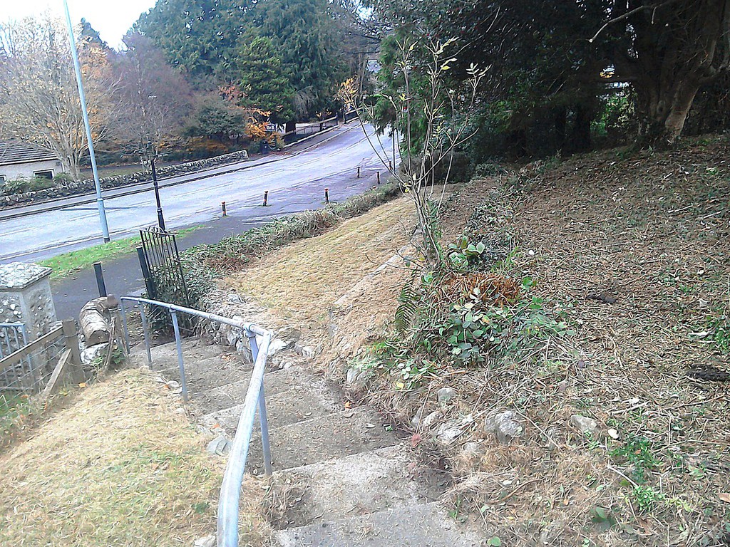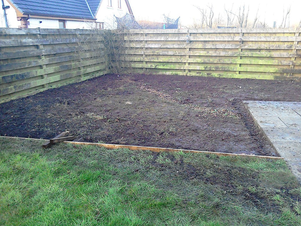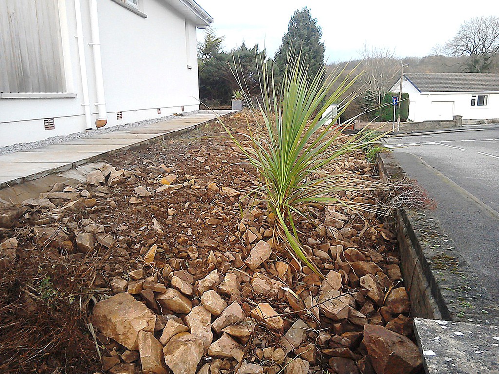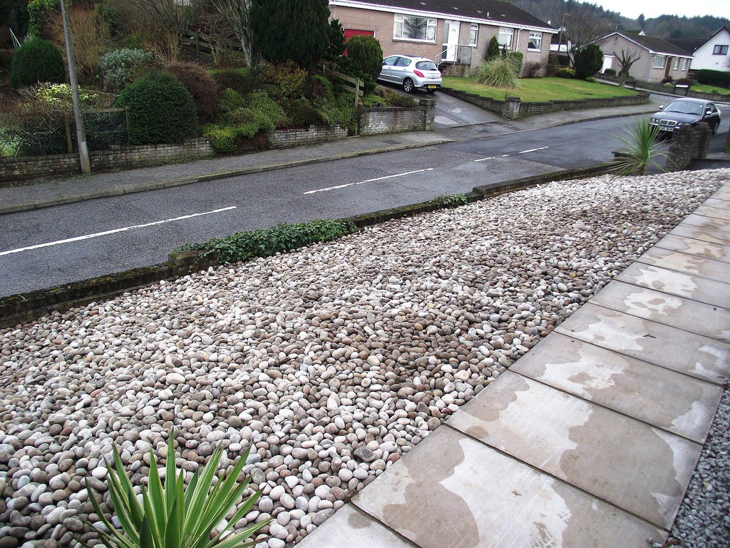 (overgrown scrub & shrub clearance, removal of conifers & ground cover, bank reduction & level ground, weed supress, cobbles, flagstones)